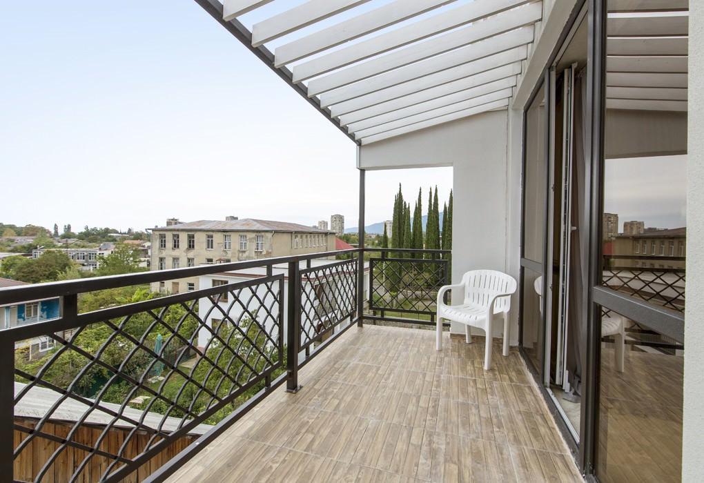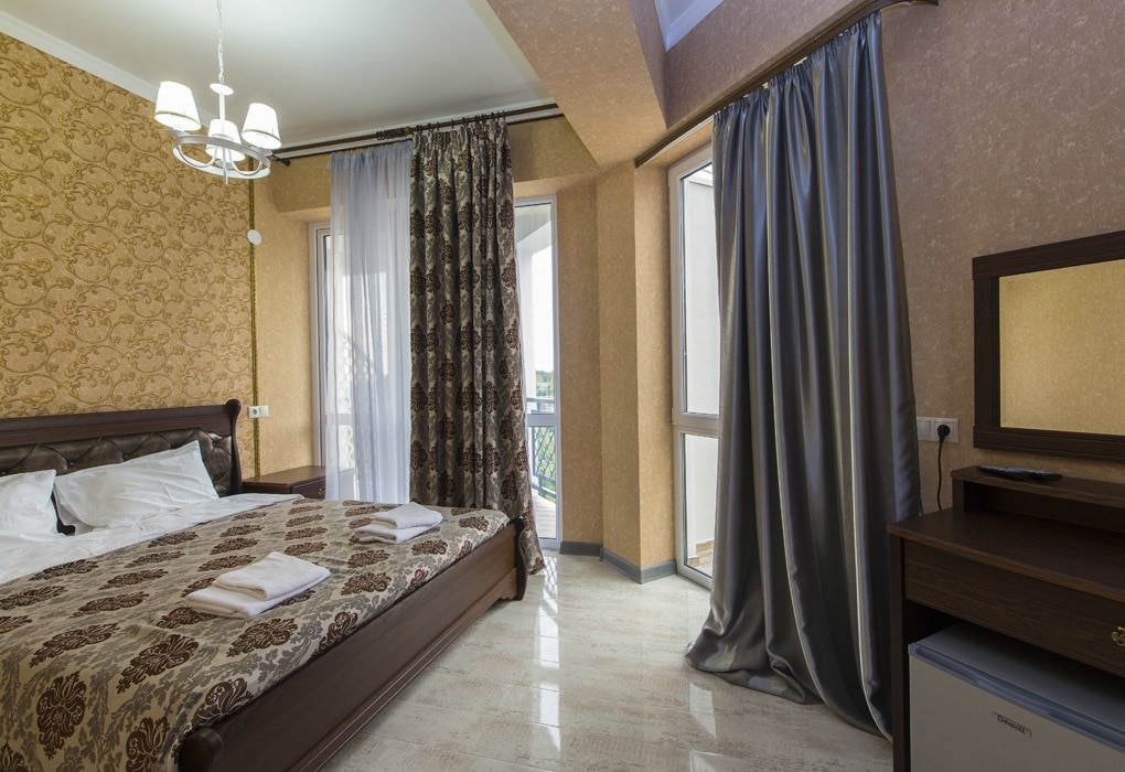 Площадь номера - 27-30 кв.м. 2 комнаты. 2 осн. места. межкомнатная арка. В номере: телевизор; холодильник; балкон; кондиционер; душ; туалет; сейф; 2-спальная кровать; чайный набор. 1 доп. место: Диван - может быть установлен без ограничения по возрасту.