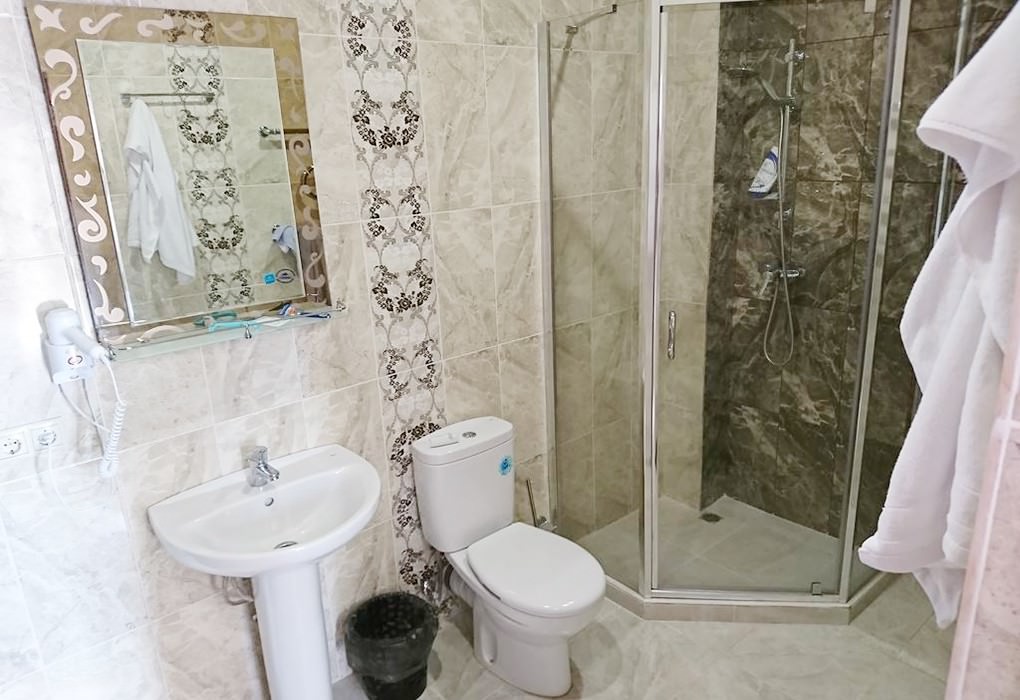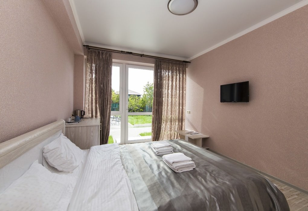 Площадь номера - 22 кв.м. 1 комната. 2 осн. места. индивидуальный вход и выход в сад, 1 этаж. В номере: телевизор; холодильник; кондиционер; туалет; сейф; 2-спальная кровать; чайный набор.