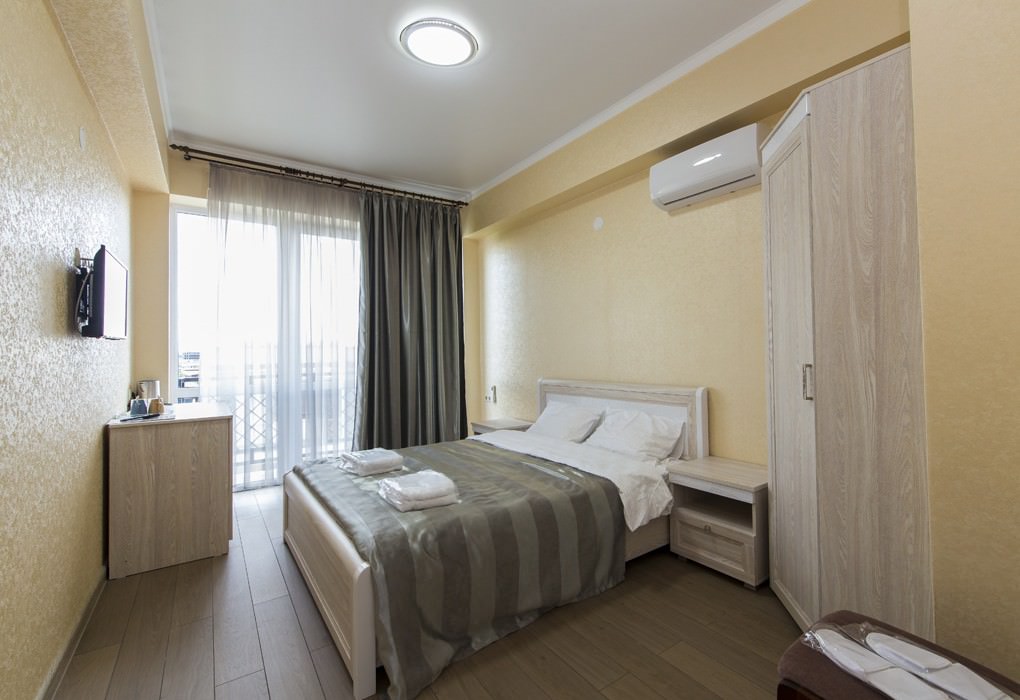 Площадь номера - 19 кв.м. 1 комната. 2 осн. места. В номере: телевизор; холодильник; балкон; кондиционер; душ; туалет; сейф; 2-спальная кровать; чайный набор. 1 доп. место: Тахта - может быть установлено без ограничения по возрасту.